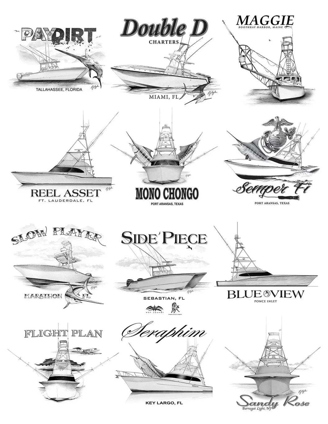 RJ's pencil designs highlight your vessel's clean lines and classic detail. For an added personal touch, you can also include hand-drawn pencil illustrations of gamefish like marlin, tuna, or swordfish. These timeless, black-and-white designs are perfect for a sophisticated look on apparel, prints, and accessories.